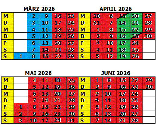 Grün = Frei ** Rot = Belegt ** Rot/Grün = Frei ab/bis zur nächsten Markierung