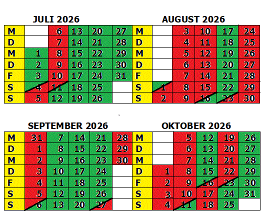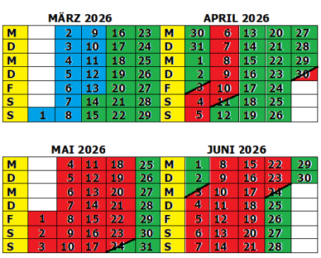 Grün = Frei ** Rot = Belegt ** Rot/Grün = Frei ab/bis zur nächsten Markierung