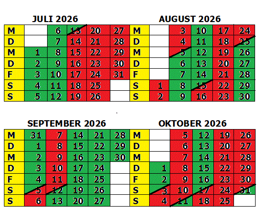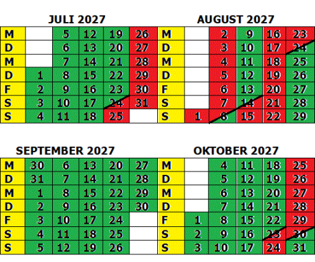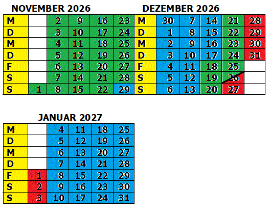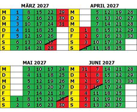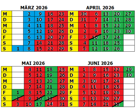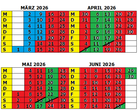 Grün = Frei ** Rot = Belegt ** Rot/Grün = Frei ab/bis zur nächsten Markierung