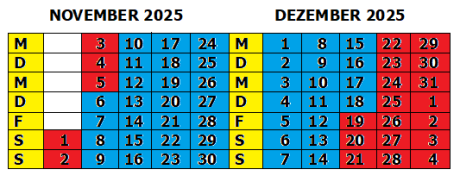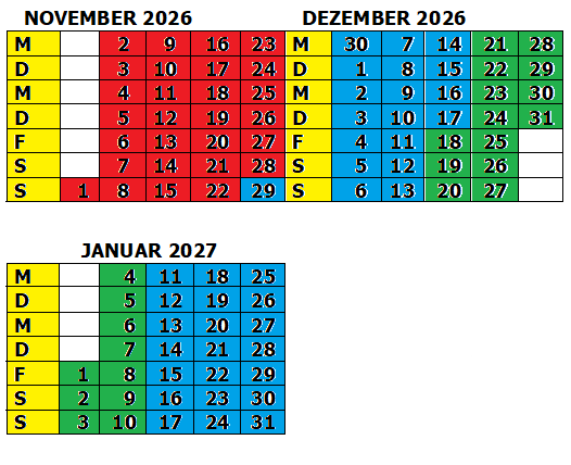 Grün = Frei ** Rot = Belegt ** Rot/Grün = Frei ab/bis zur nächsten Markierung